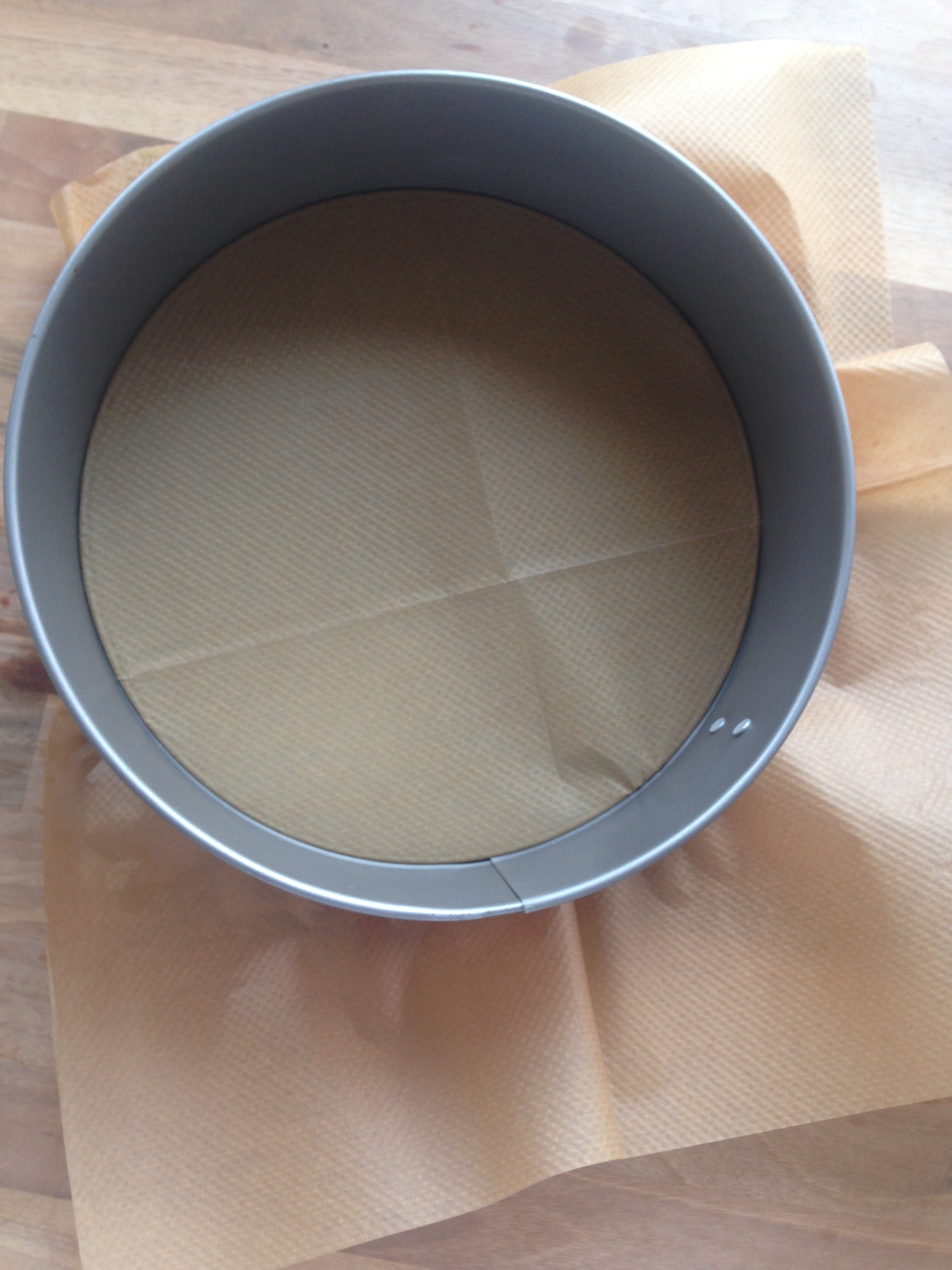 Den Boden einer 18cm Backform mit Backpapier auslegen und den Ring darum spannen.