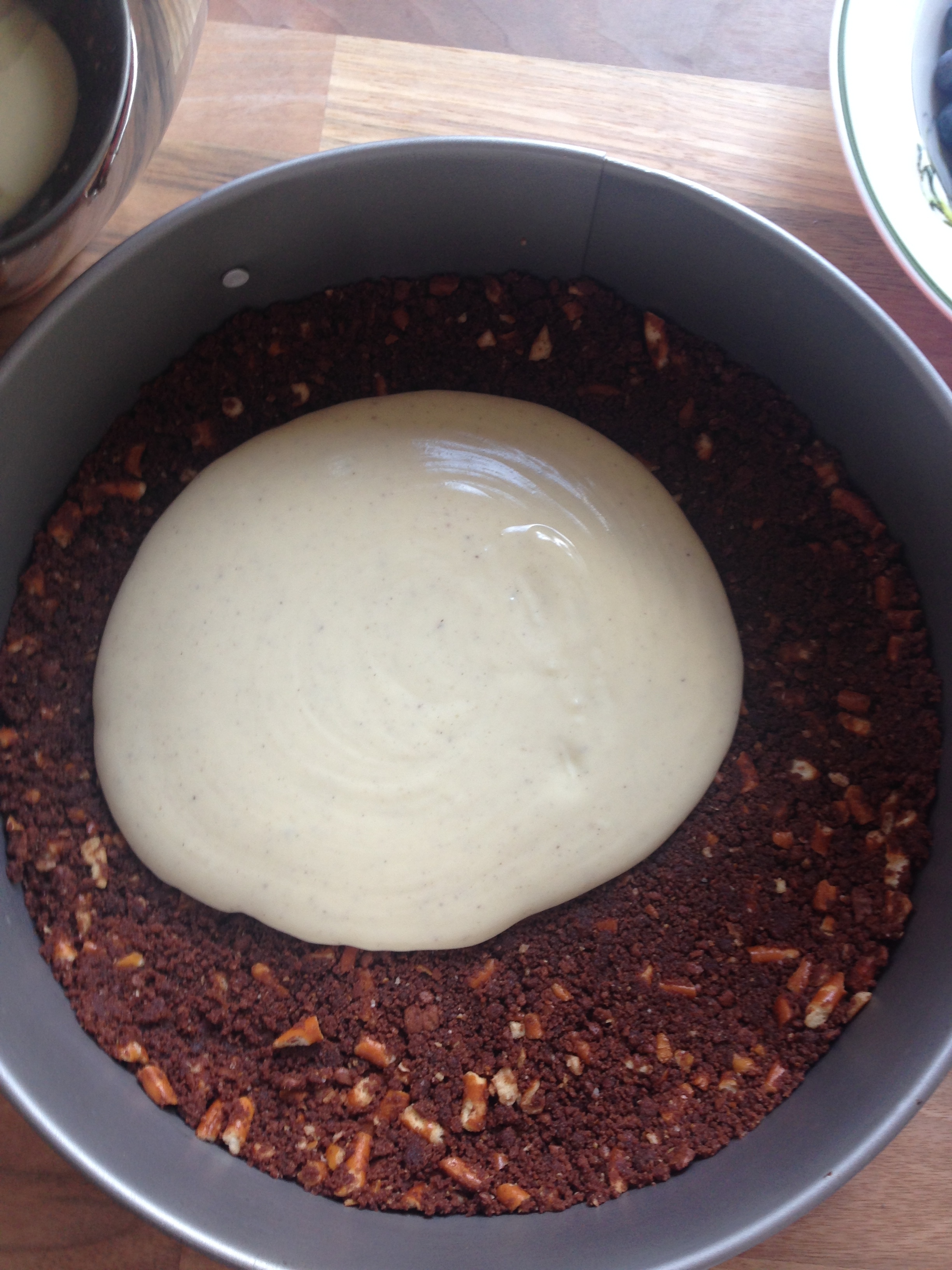 Das letzte Drittel der Blaubeeren darunter geben und alles auf den etwas abgekühlten Kuchen gießen.